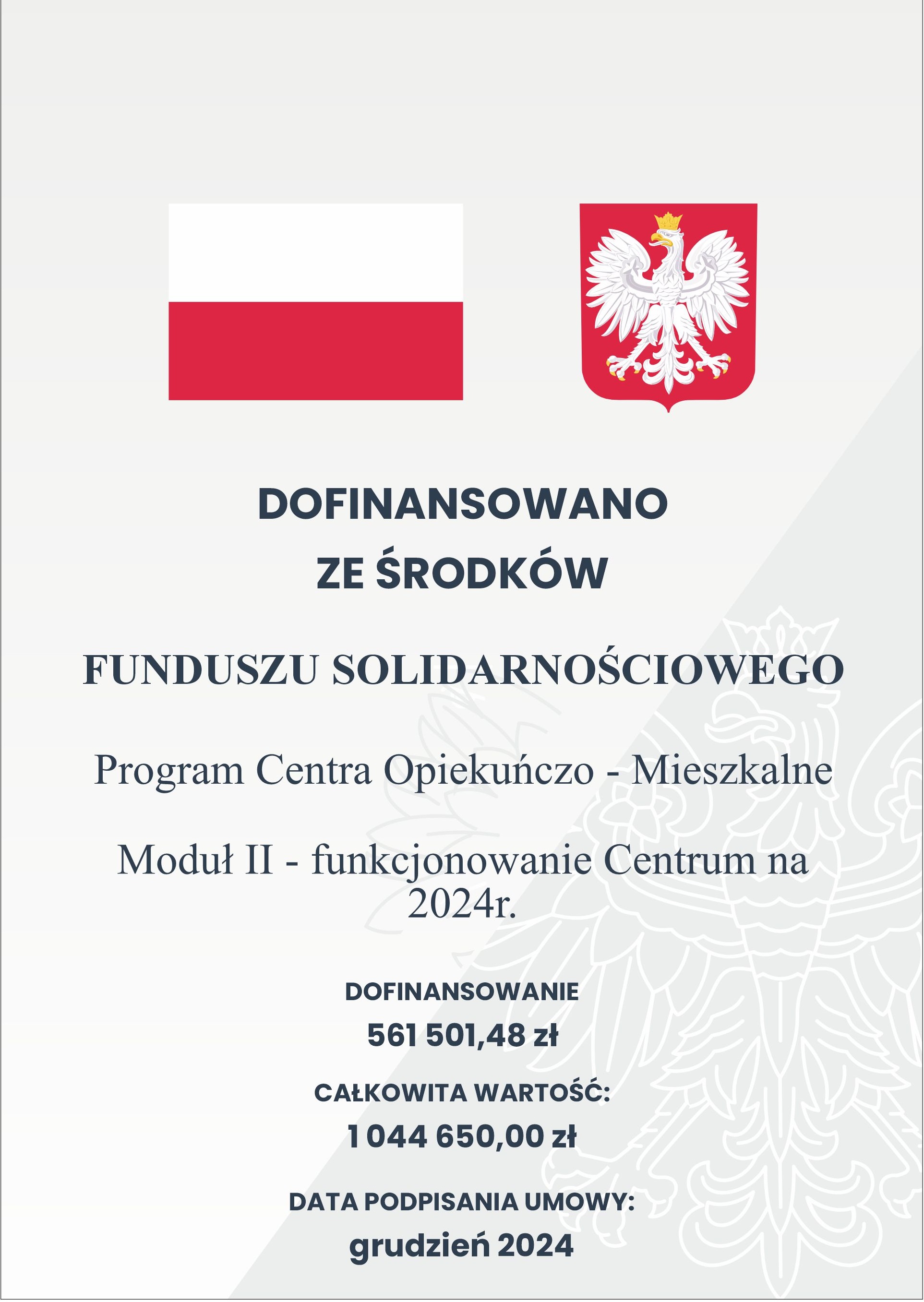 DOFINANSOWANO ZE ŚRODKÓW FUNDUSZU SOLIDARNOŚCIOWEGO Program Centra Opiekuńczo-Mieszkalne Moduł II - funkcjonowanie Centrum na 2024 r.